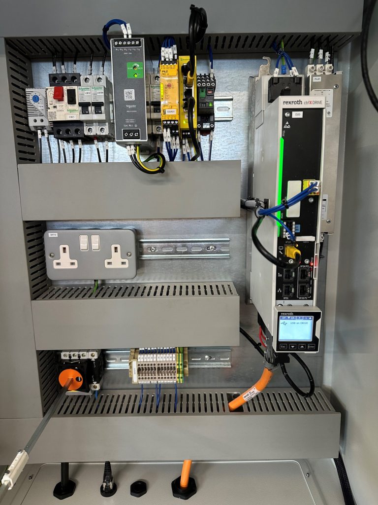 The Bosch Rexroth drive and Beijer HMI was packaged into a control panel along with the required safety protection to create a finished solution.