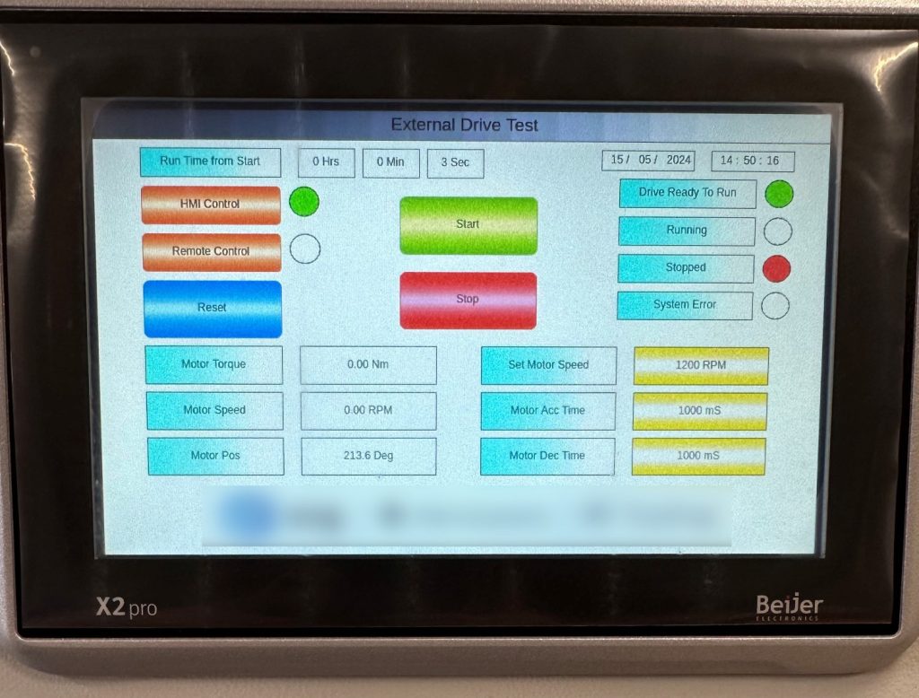 Dante Technical Solutions wrote a PLC program that ran inside of the drive core. The program acted as a gateway between the drive and the outside world. The WebVisu app was employed to spool HMI web pages to a Beijer X2 Pro HMI thus allowing for manual control and system diagnostics.